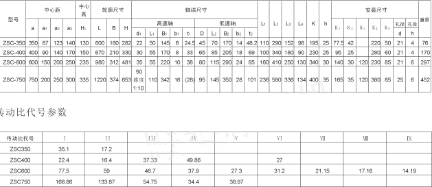 ZSC立式行走減速機傳動比代號 Ⅰ Ⅱ Ⅲ Ⅳ Ⅴ Ⅵ Ⅶ Ⅷ Ⅸ 傳動比: ZSC350齒輪減速機速比: 35.1 17.2 ZSC400齒輪減速機速比: 16.2 22.4 37.33 49.86 32.4 27.07 ZSC600齒輪減速機速比:77.5 59 46.7 37.9 27.3 31.2 21.15 17.16 14.19 ZSC750齒輪減速機速比: 166.58 133.91 54.51 34.51 38.97 .19.97