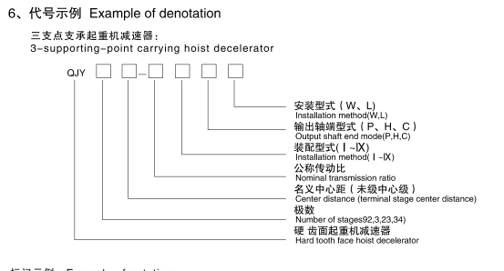 QJYD23起重機用硬齒面減速機為起重機專用減速機,型號有:QJYD23-170,QJYD23-200,QJYD23-236,QJYD23-280,QJYD23-335,QJYD23-370,QJYD23-400,QJYD23-450起重機用減速機,QJYD23-500,QJYD23-560,QJYD23-630,QJYD23-710,QJYD23-800起重機硬齒面減速機十三種型號,是以末級中心距為型號,每一型號有九種裝配型式,輸出軸端型式有三種,P圓柱軸伸平鍵,單鍵聯接,H圓柱軸伸漸開線花鍵聯接,C齒輪軸端。